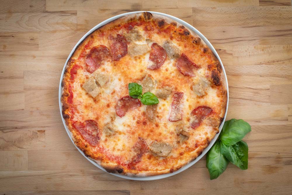 Pomodoro, mozzarella, salsiccia, funghi porcini, grana