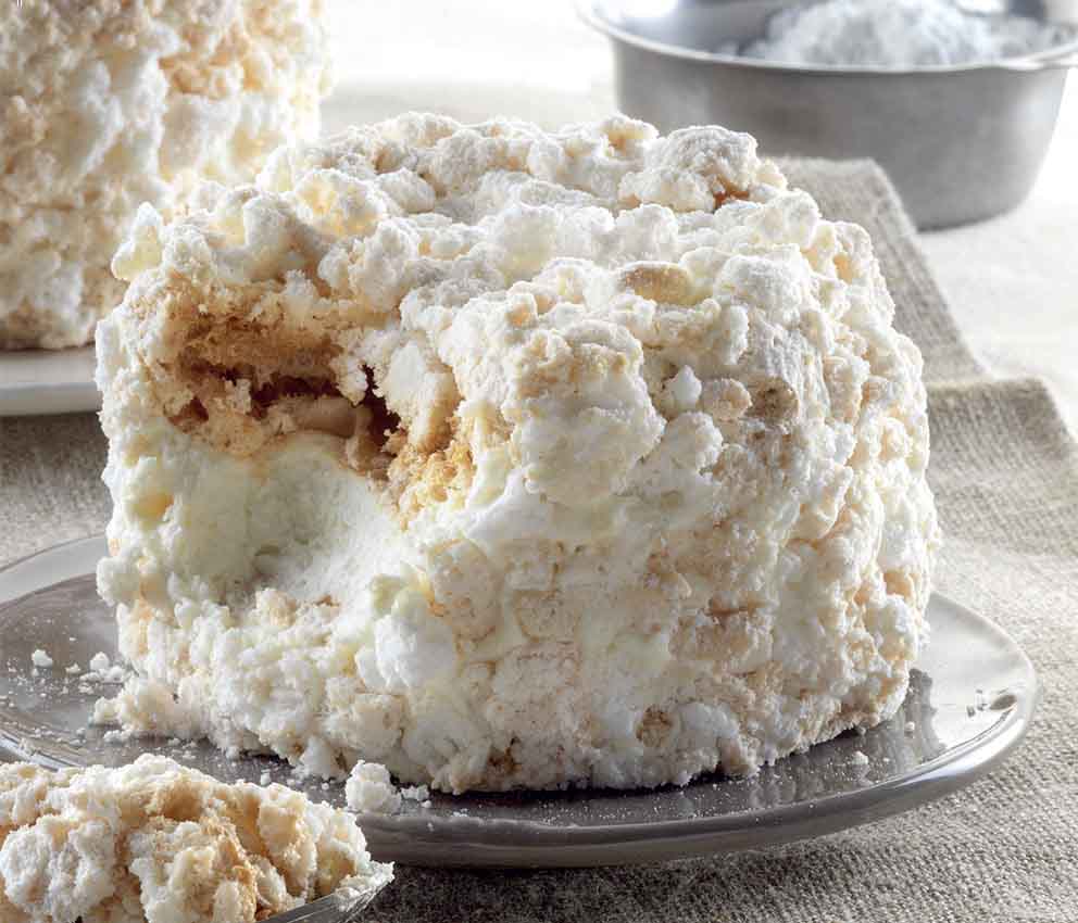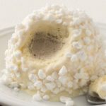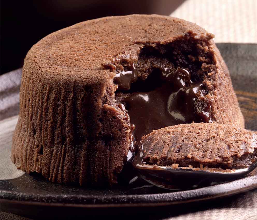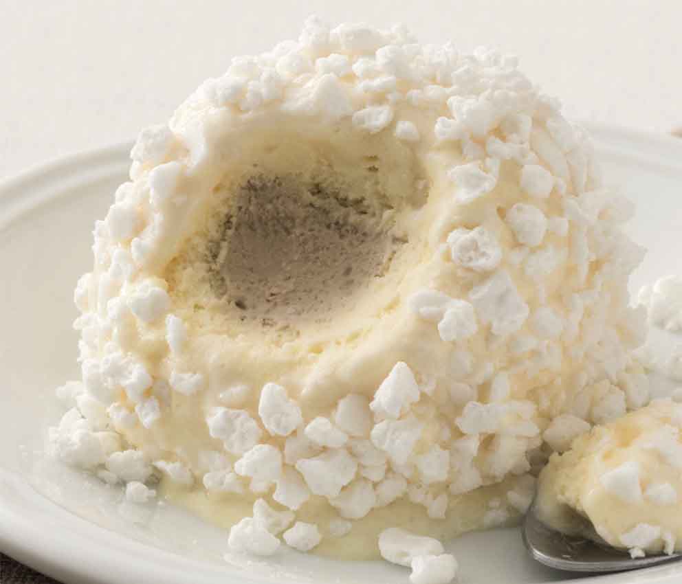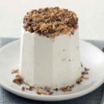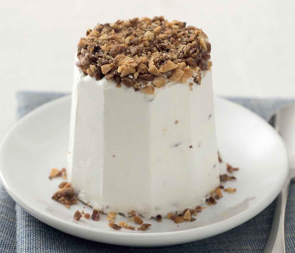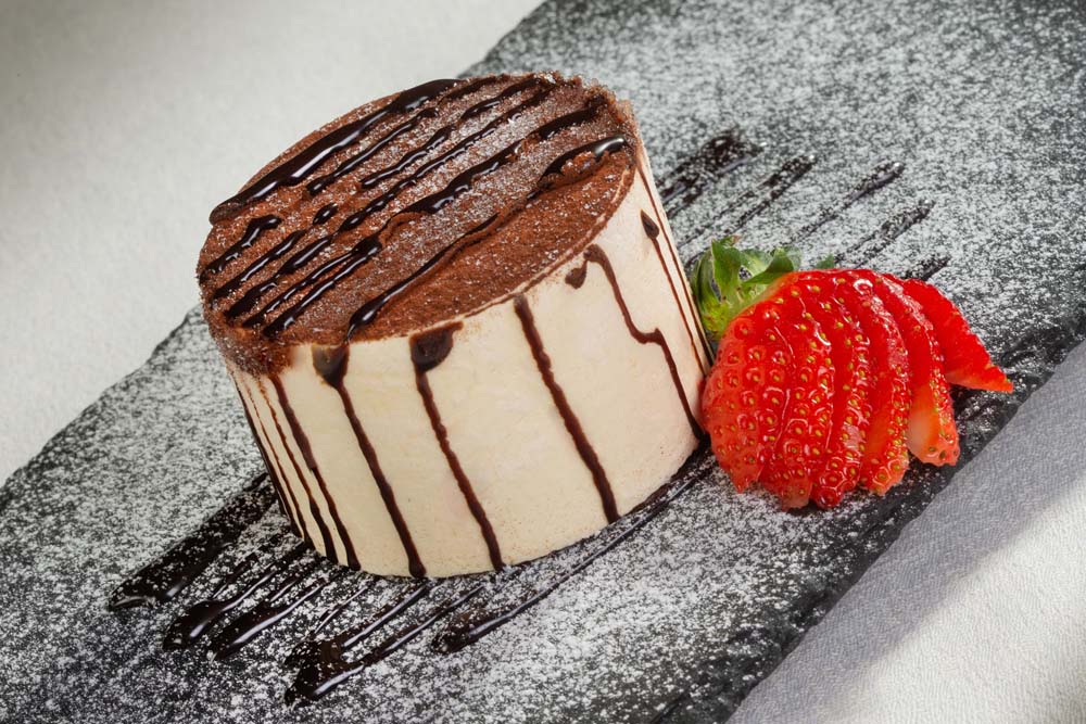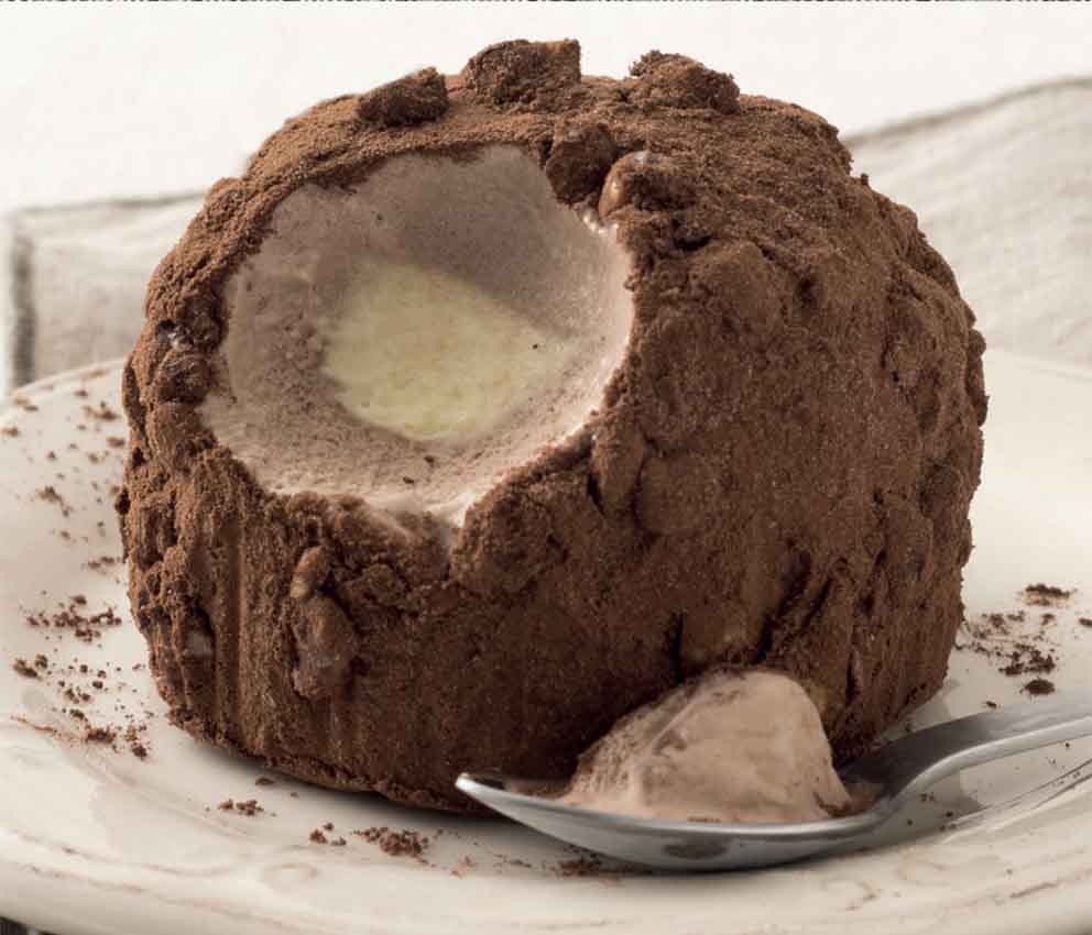 servito con scaglie di cioccolato dark e croccante di nocciole